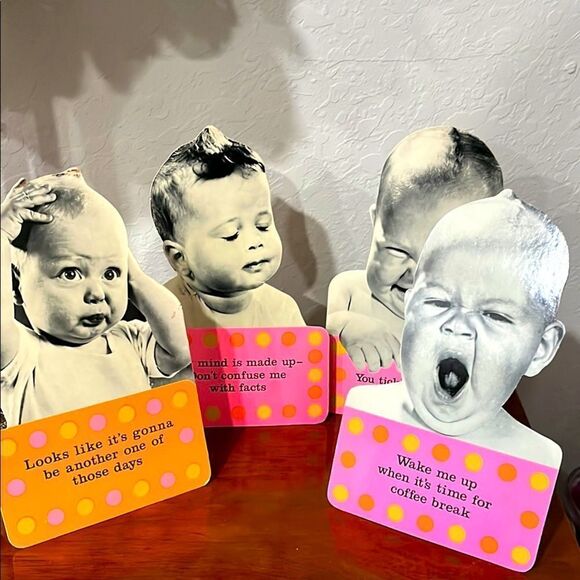 Set of Four vintage-style baby photo signs. Each features a humorous quote. Perfect for home decor or gifts.