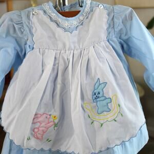 Sweet nostalgic baby blue dress with white pinafore featuring adorable embroidered bunnies. This darling vintage piece captures perfect cottagecore aesthetic for special occasions, photos, or Easter celebrations. A charming heirloom-quality garment with delicate details. Small stain near armpit, pictured.