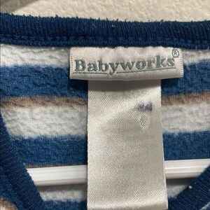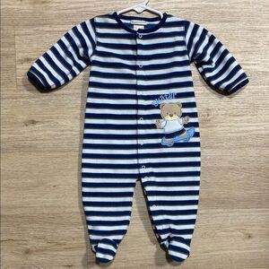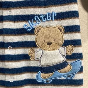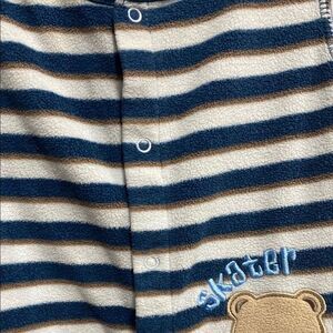 Adorable vintage Babyworks® baby sleeper in a classic navy blue, white, and brown striped pattern. This cozy footed onesie features a full snap-up front for easy changing and a super cute embroidered bear on a skateboard with the word “Skater.” Soft, warm velour-like fabric — perfect for keeping your little one snug and stylish.