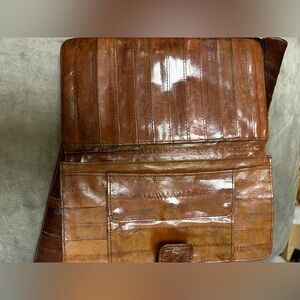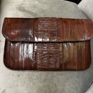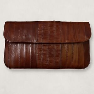 beautiful vintage women’s clutch and matching wallet set from Back Bay Ltd. (Dallas, Texas). Crafted in Korea from genuine leather, this set features a rich brown finish with unique textured striping. Perfect for carrying essentials with timeless vintage style.