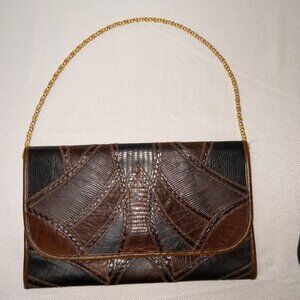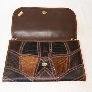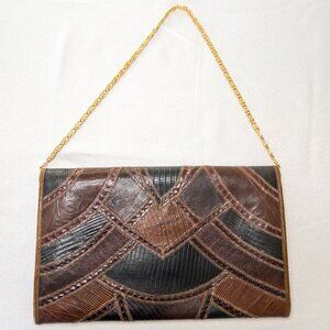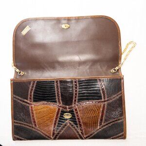 Vintage Bags by Varon Snakeskin Patchwork Clutch / Crossbody โ Brown & Black Exotic Leather, Gold Chain