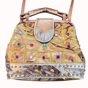What – Baikal New York gold metallic beaded purse with jeweled embellishments and structured handle design