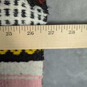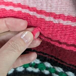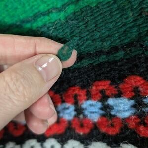 Condition: Fair vintage condition with noticeable flaws. There are multiple yarn pulls and loose threads throughout, and fraying is present along the bottom hem with some unfinished edges. See close-up photos for examples of these flaws.