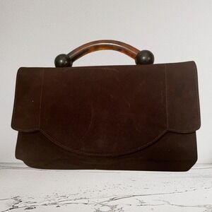 Elegant vintage handbag, perfect for adding a touch of classic sophistication to any outfit. This refined clutch features a rich brown suede exterior complemented by a unique tortoise-style handle with dark spherical accents. The bag opens to reveal a silky brown interior, complete with a small change purse for added functionality. Pair this handbag with a cocktail dress for a night out, or style it with tailored separates for a polished daytime look. It's also a lovely choice to elevate a more casual look for a dinner date.