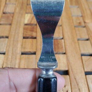 The black Bakelite handles are clean, sleek and form a refined contrast with the polished metal — ideal for collectors of mid-century kitchenware or stylized table settings.