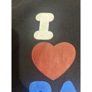 This shirt was very loved. It’s black but faded. There are cracks in the letters and heart.