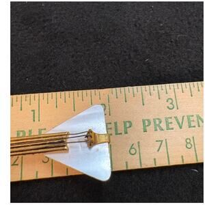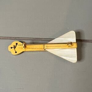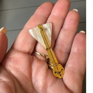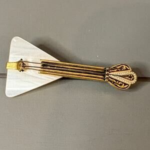 This vintage Balalaika brooch is a dainty and charming piece, perfect for adding a touch of elegance to any outfit. Measuring 2 inches, it features a beautifully carved mother of pearl design that captures the eye. The brooch is in excellent condition, ensuring it will be a treasured addition to your jewelry collection. Its intricate details and classic appeal make it a unique and timeless accessory. Don't miss the opportunity to own this exquisite vintage brooch that showcases craftsmanship and style. A perfect gift for music lovers or vintage jewelry enthusiasts!