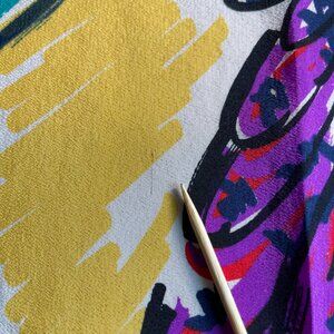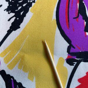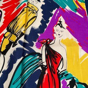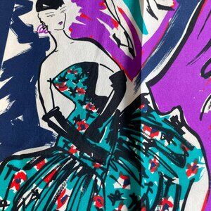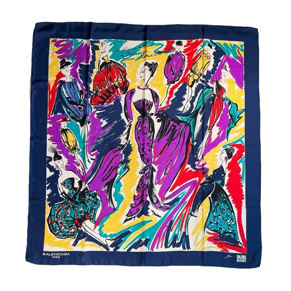 A stunning and rare Balenciaga x Paris Musées silk scarf featuring vibrant archival fashion illustrations rendered in bold shades of violet, red, yellow, teal, and black. This collectible piece pays homage to Balenciaga’s couture heritage and showcases the dramatic elegance of mid-century fashion sketches.
