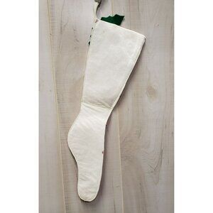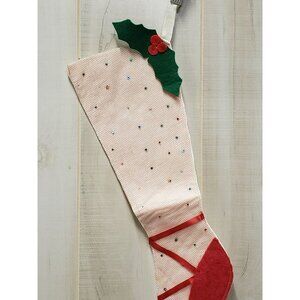 Embodying a nostalgic charm, this vintage Christmas stocking is adorned with festive holly and red berries at the top and red net "stocking" and foil stars on the leg. Its classic red slipper adds timeless holiday appeal.