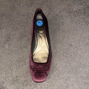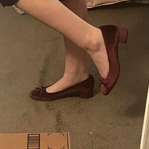 the cutest vintage berry / wine red velvet kitten heels with bows and square toes. barely worn and in such good condition. fits like a true 7.5, i have cushion stickers on the heels, but they can easily come off with no residue (i put them on to try to make the shoes fit, but they were too big lol). so dainty and pretty ♥️ would be so cute at a renaissance fair or everyday wear, they can be dressed up or casual