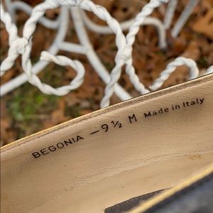 Vintage Navy Blue Leather with Gold Accents High Heels! Made in Italy Begonia size 9.5 M... they do shows signs of wear to the soles and inside footbed! The heel caps have been replaced! Great overall condition for their age!