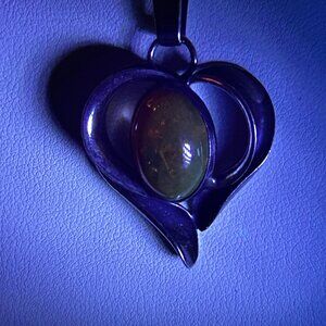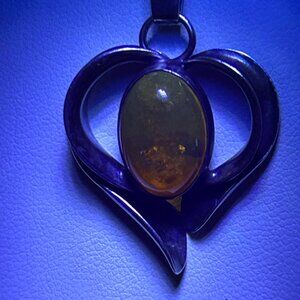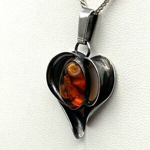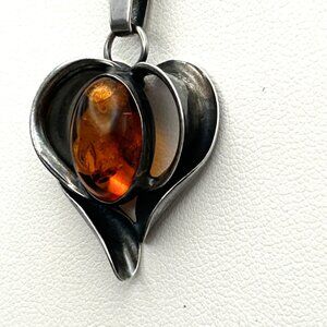 The vintage necklace features a striking heart shaped pendant crafted in solid sterling silver and set with a natural Baltic amber cabochon. The amber displays warm reddish-orange tones with natural inclusions and fluoresces under UV light (see photos).
