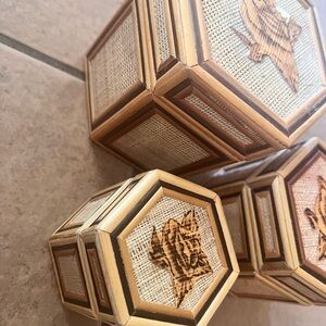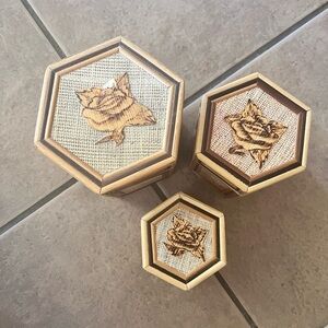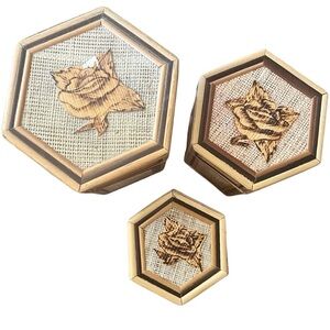 Vintage Bamboo Nesting Trinket Hexagon Jewelry Boxes Roses Retro Boho