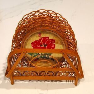 Vintage Bamboo Rattan Hibiscus Flower Set of 5 Coasters with Caddy