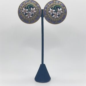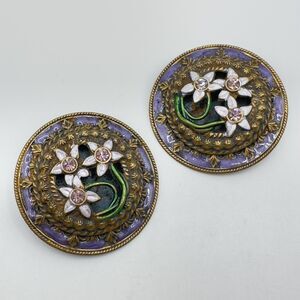 Vintage Banana Bob Earrings Statement Clip On Enamel Romantic Floral Rhinestone