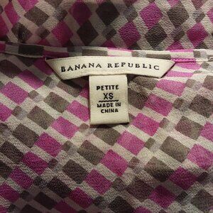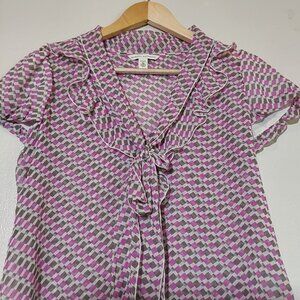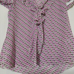 Beautiful sheer ruffle 100% silk vintage blouse from Banana Republic. Pink and gray check pattern. V-neck with bow. Good condition with no flaws seen.