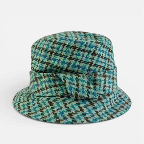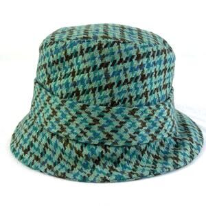 Vintage Banana Republic Teal Houndstooth Plaid Bucket Hat in good VTG condition. Wool nylon blend with poly lining. Wide downturned brim with bow detail.