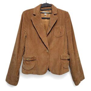 Classic 1990s Banana Republic corduroy blazer in rich tan/camel. Thick wide-wale 100% cotton with a tailored, single-breasted silhouette—easy smart-casual or academia vibe. Notch lapels, 2-button front, single chest pocket, and two flap pockets with button closures. Regular fit; perfect over tees, knits, or a button-down. Pre-owned in great shape—clean, ready to wear.