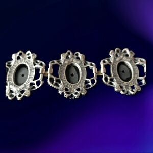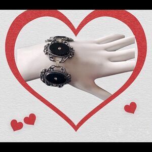Elaborate vintage Banana Bob unusual Victorian style bracelet. The bracelet consists if oval shaped black disks in a ornate ox silver setting , new old stock , sample. Very rare design. Measures 7.5”L x 1.5” H. Please see all photos for full description. Questions? Please ask below.
