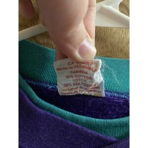 Cozy up in this vintage Banff Canada vacation sweater! The purple and aqua green collar and embroidered details add a touch of Canadian charm to this classic piece. Perfect for collectors of travel memorabilia or those who love a good vintage find, this sweater is a must-have addition to any wardrobe. Made in Canada, this sweater is a true piece of Canadiana.
