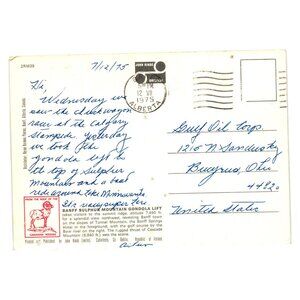 This vintage postcard from 1975 showcases the breathtaking view from the Banff Sulphur Mountain Gondola Lift in Alberta, Canada. A nostalgic piece of history, capturing the serene landscape and iconic gondola, perfect for collectors or those fond of travel memorabilia.