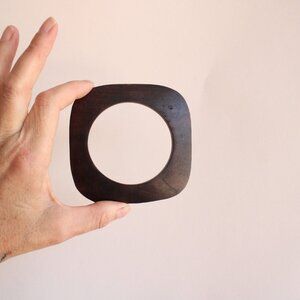 Pretty vintage carved wood bangle. Open center measures 2.5" in diameter. The width of the whole thing is just under 4". No designer marks. See my other listings for a second similar bracelet that would look lovely with this worn together.