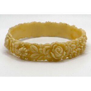 Delve into the charm of the past with this Vintage Bangle Bracelet, a exquisite piece crafted from carved celluloid. The bracelet showcases an intricate floral design, with yellow roses and flowers that exude a vintage aesthetic. With its creamy main stone color set in a halo style, this accessory is a lovely addition to any jewelry collection.