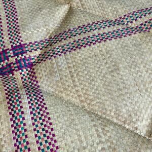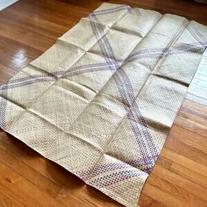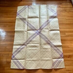 Vintage banig—a traditional Filipino handwoven mat—crafted using natural fibers (likely pandanus or buri leaves) and dyed woven into an elegant diagonal plaid pattern in purple, blue, and pink. The banig measures approximately 47″ × 70″, making it versatile for use as a floor or sleeping mat, picnic blanket, or decorative wall hanging. Vintage condition shows light wear, including one small faded blue marker spot on the back (see 3rd photo).