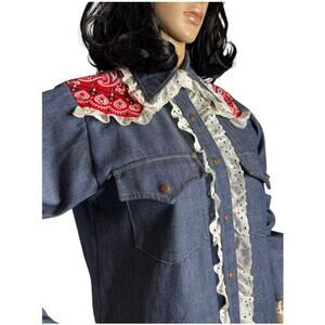What a great blue denim shirt with dagger collar and a red print fabric on shoulder and back, white eyelet trim around collar, cuffs,down the front, shoulder and back, snap front closing and cuffs