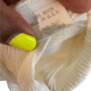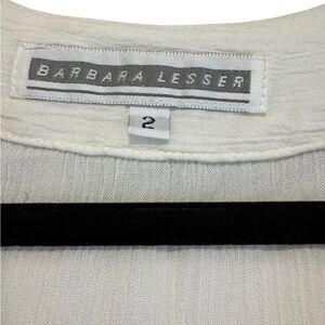 Vintage Barbara Lesser Maxi Sleeveless Ivory Dress with Turquoise Buttons is in excellent preowned condition. There are small slits on each side of the dress. This is lightweight and breezy and makes for a great dress or beach coverup. It is not sheer but my hand can be seen through the fabric.