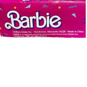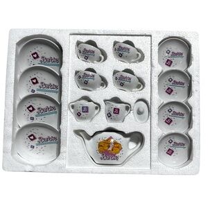 Barbie china dinner set with pink and white design. Includes 16 pieces.