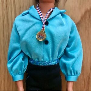 Delightful vintage USA Olympic Skater Ken from 1997 by Mattel Barbie. Ken has an articulated body, allowing him to move and pose in ways her other Ken dolls could not. He features the handsome features of the 90s with sculpted, lightly dimpled cheeks, blue eyes, a broad, toothy smile and rooted brown hair. He wears his original ice skating outfit, with Olympic Gold Medal. Please note his ice skates no longer have blades on the bottoms, as we removed them for my daughter so he could “stand” like her other Barbies. My daughter did play with this Ken so he’s not perfect, but I think he looks and works great. He’s a fabulous doll!