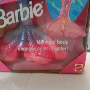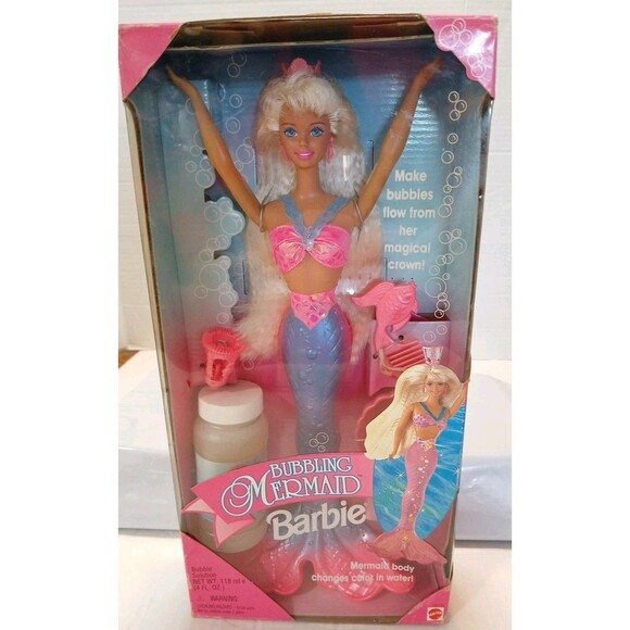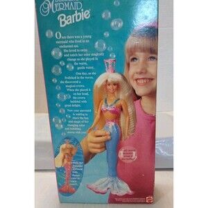 The Vintage Barbie Bubbling Mermaid Doll from 1996 is a collector's item that is new in box and factory sealed. This 12-inch doll features blonde wavy hair, blue eyes, and a light complexion. Part of the Barbie Mermaid Series, this fashion doll is made of vinyl and plastic, with water-resistant features and no batteries required. The set includes the doll and accessories, making it a perfect addition for fans of Barbie and mermaids. This item is a single unit and comes in its original unopened packaging, adding to its vintage appeal. The last 5 photos show damage to the box. The damages are minimal and are from how the item had been stored. There's no rips or tears on the box.