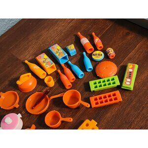52-piece Barbie Dream Home Lot. Wear to the labels on the bottles. One label on the milk carton has come off. Nice lot.