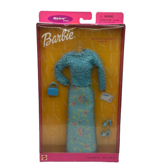 This charming Fashion Avenue set from 2000 features Barbie’s “Brunch in Boston” look — a cozy textured teal sweater paired with a floral maxi skirt for a sweet, city-chic style. The outfit comes complete with matching teal heels, a coordinating handbag, and a small printed fashion card accessory.