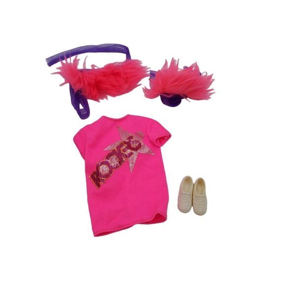 Item: Vintage Barbie Rockers Oversized Shirt, 2 Fuzzy Hair Accessories (I guess that is what they are for) and a pair of white shoes