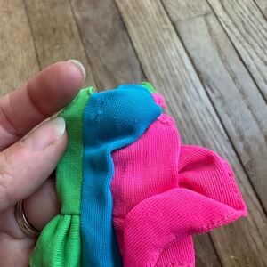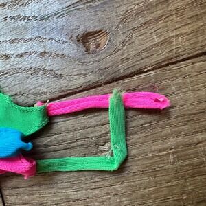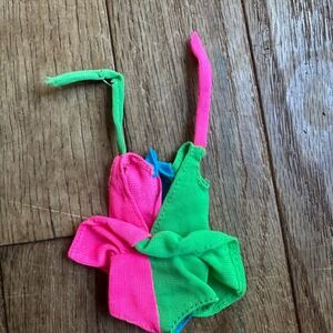 Dazzling vintage Barbie swimsuit is a vibrant piece of nostalgia, featuring a playful tri-color design of bright green, cool blue, and hot pink. This original outfit for Skipper evokes a sense of retro fun, transporting you back to the imaginative playtime of the past. A charming ruffle detail adds a touch of girlish whimsy, while the unique construction showcases the iconic design of this classic doll accessory. Imagine the endless stories you can create with this iconic ensemble, perfect for collectors and enthusiasts alike. The halter tie is torn and this is missing the original button as shown.