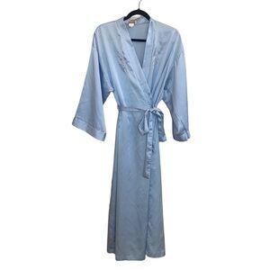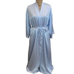Vintage Barbizon Full Length Robe Blue Embroidered Pink Flowers Belted Size M