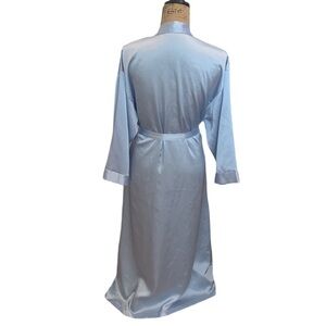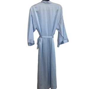 Vintage Barbizon Full Length Robe Blue with Embroidered Pink Flowers with attached belt, side pockets. Three quarter length wide cuff sleeves. Soft satin feeling - material content/size label is faded. Please see measurements. In excellent condition for a vintage piece. Some signs of wear as shown.