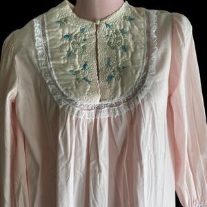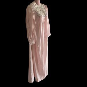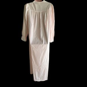 Soft pink long sleeve nightgown with delicate white lace trim at the collar and cuffs.