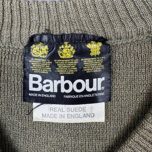 Description: This vintage Barbour sporting sweater is a classic piece of British outdoor style. Sized as a men's small, it's made from a cozy wool blend with a traditional ribbed knit. The unique suede trim and elbow pads add a touch of rugged elegance, making this green sweater a perfect choice for both outdoor activities and timeless casual wear.