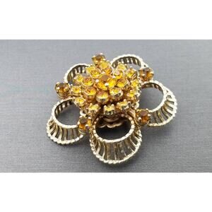 Unique tiered goldtone brooch with detailed openwork, dark and light rhinestones (when I list the name of the color, the listing gets deactivated). Please see photos.