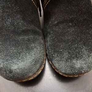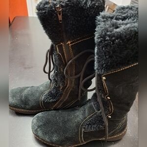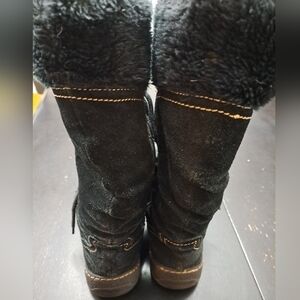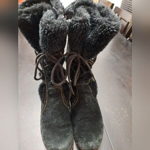 good condition, black suede with faux fur lining, inside zipper, Lace up, thick gold stitching, rubber sole, some heel drag