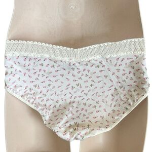 Details: Features a delicate rosebud and leaf design with soft, scalloped lace trim waistband.
