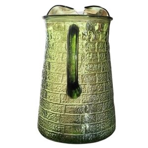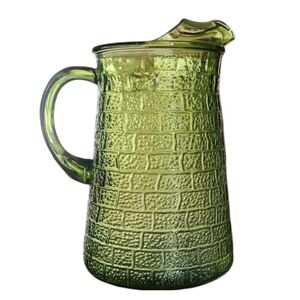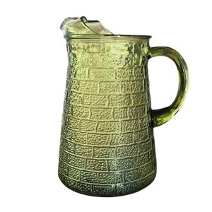 Excellent pre owned condition. Vintage - Barlett Collins Mid Century Modern Brick Road Avocado Glass Pitcher. Brick Road Pattern. No seams.  Ice lip. Handle. 8.5" tall 5.5" diameter. Made on Indiana