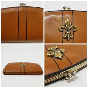 Wonderful vintage brown leather & black trim wallet with goldtone fleur de lis symbol, four slip in pockets, two clear inside pockets, kiss lock clasp closure and two snap button closures.