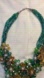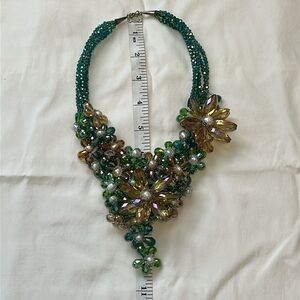 Make an entrance and statement with this stunning necklace features a vibrant floral design with green and gold beads, Adored with Baroque Pearls, perfect for adding a touch of elegance to any outfit.
