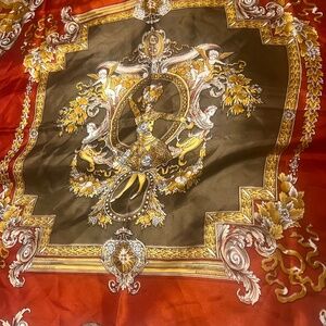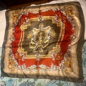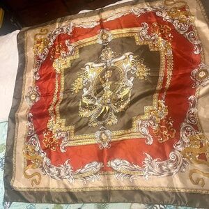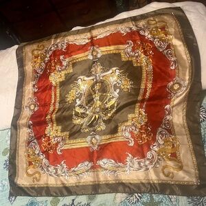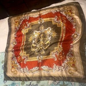 Elevate your look with this stunning vintage-inspired baroque print scarf. Features an intricate design with cherubs, scrollwork and gold flourishes in rich shades of deep red, olive and gold. Approx. size: 34"x34". Fabric is Satin twill. Edges are machine stitched.Excellent vintage condition~ clean, vibrant print, no snags or stains. 80s-90s vintage-inspired. Perfect as a headscarf, neck accessory, handbag wrap or framed a vintage decor.