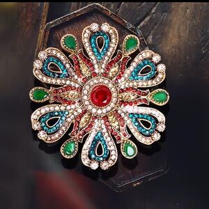 This stunning brooch features a captivating design with red, green, and silver tones. Perfect for adding a touch of elegance to any outfit.