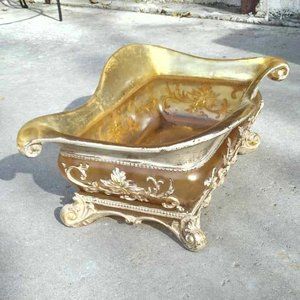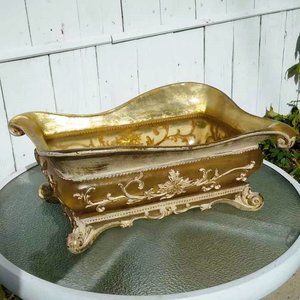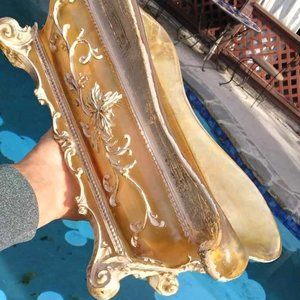 This vintage serving dish is a stunning piece of baroque design, crafted from yellow (reflects as Gold), translucent lucite acrylic resin. It has fabulous scrolled Baroque carvings accented in white and hand painted throughout the piece and stands on an intricate scroll footed base - it makes the perfect addition to any retro or mid-century collection. It is also perfect for any Shabby Chic environment.